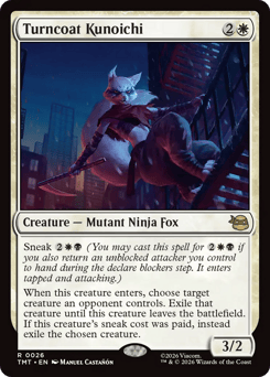 Sneak {1}{W} (You may cast this spell for {1}{W} if you also return an unblocked attacker you control to hand during the declare blockers step.) Create three 1/1 white Ninja Turtle Spirit creature tokens. If this spell's sneak cost was paid, they enter tapped and attacking.