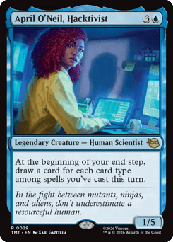 When April O'Neil enters, scry 2. (Look at the top two cards of your library, then put any number of them on the bottom and the rest on top in any order.) April O'Neil can't be blocked by creatures with power 3 or greater.