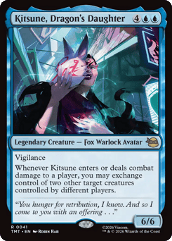 Vigilance Whenever Kitsune enters or deals combat damage to a player, you may exchange control of two other target creatures controlled by different players.