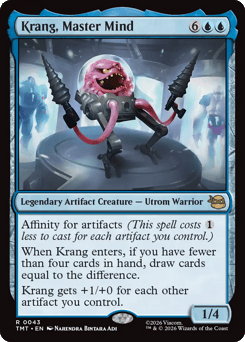Affinity for artifacts (This spell costs {1} less to cast for each artifact you control.) When Krang enters, if you have fewer than four cards in hand, draw cards equal to the difference. Krang gets +1/+0 for each other artifact you control.