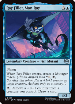 Flying When Ray Fillet enters, create a Mutagen token. (It's an artifact with "{1}, {T}, Sacrifice this token: Put a +1/+1 counter on target creature. Activate only as a sorcery.") {2}, Remove a +1/+1 counter from a creature you control: Draw a card.