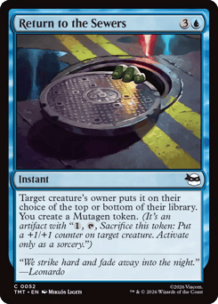 Target creature's owner puts it on their choice of the top or bottom of their library. You create a Mutagen token. (It's an artifact with "{1}, {T}, Sacrifice this token: Put a +1/+1 counter on target creature. Activate only as a sorcery.")