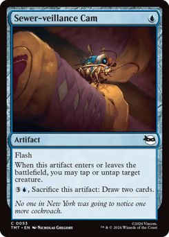 Flash When this artifact enters or leaves the battlefield, you may tap or untap target creature. {3}{U}, Sacrifice this artifact: Draw two cards.