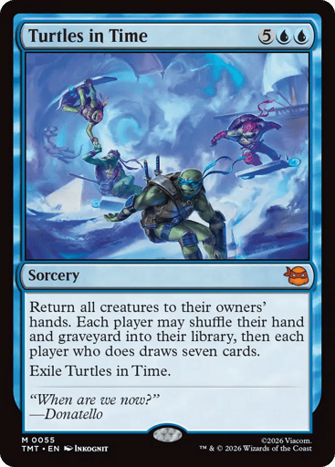 Return all creatures to their owners' hands. Each player may shuffle their hand and graveyard into their library, then each player who does draws seven cards. Exile Turtles in Time.