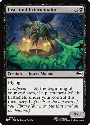 Flying Disappear — At the beginning of your end step, if a permanent left the battlefield under your control this turn, create a 1/1 black Insect Warrior creature token with flying. {3}{G}, Sacrifice a token: Draw a card.