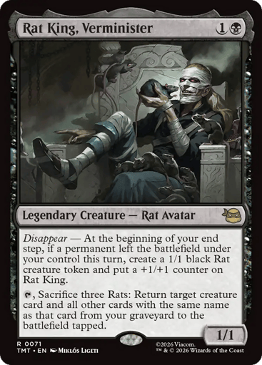 Disappear — At the beginning of your end step, if a permanent left the battlefield under your control this turn, create a 1/1 black Rat creature token and put a +1/+1 counter on Rat King. {T}, Sacrifice three Rats: Return target creature card and all other cards with the same name as that card from your graveyard to the battlefield tapped.