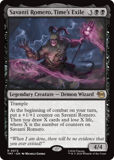 Trample At the beginning of combat on your turn, put a +1/+1 counter on Savanti Romero. Then you draw X cards and lose X life, where X is the number of counters on Savanti Romero.