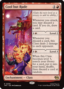 (Gain the next level as a sorcery to add its ability.) Whenever you attack, you may discard a card. If you do, draw a card. {1}{R}: Level 2 Whenever you discard a card, this Class deals 2 damage to each opponent. {1}{R}: Level 3 When this Class becomes level 3, search your library for a card, put it into your hand, shuffle, then discard a card at random.