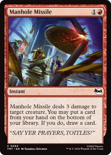 Manhole Missile deals 3 damage to target creature. You may put a card from your hand on the bottom of your library. If you do, draw a card.