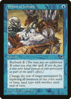 Buyback {2} (You may pay an additional {2} as you cast this spell. If you do, put this card into your hand as it resolves.) Change the text of target permanent by replacing all instances of one color word with another or one basic land type with another until end of turn. (For example, you may change "nonred creature" to "nongreen creature" or "plainswalk" to "swampwalk.")