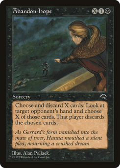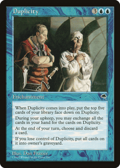When this enchantment enters, exile the top five cards of your library face down. At the beginning of your upkeep, you may exile all cards from your hand face down. If you do, put all other cards you own exiled with this enchantment into your hand. At the beginning of your end step, discard a card. When you lose control of this enchantment, put all cards exiled with this enchantment into their owner's graveyard.