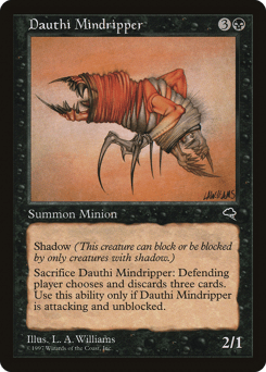 Shadow (This creature can block or be blocked by only creatures with shadow.) You may choose not to untap this creature during your untap step. Whenever this creature deals damage to an opponent, tap target creature. That creature doesn't untap during its controller's untap step for as long as this creature remains tapped.