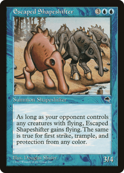 As long as an opponent controls a creature with flying not named Escaped Shapeshifter, this creature has flying. The same is true for first strike, trample, and protection from any color.