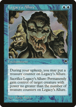 At the beginning of your upkeep, you may put a treasure counter on this enchantment. Sacrifice this enchantment: Gain control of target creature with power less than or equal to the number of treasure counters on this enchantment. (This effect lasts indefinitely.)