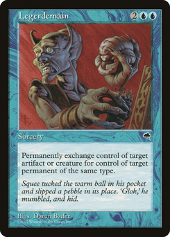 Exchange control of target artifact or creature and another target permanent that shares one of those types with it. (This effect lasts indefinitely.)