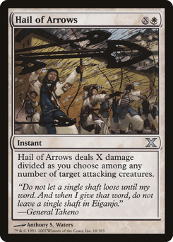 Hail of Arrows deals X damage divided as you choose among any number of target attacking creatures.