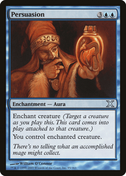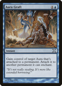 Gain control of target Aura that's attached to a permanent. Attach it to another permanent it can enchant.