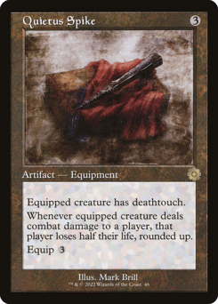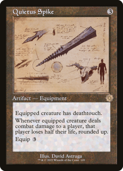 Equipped creature has deathtouch. Whenever equipped creature deals combat damage to a player, that player loses half their life, rounded up. Equip {3}