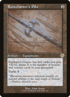 Equipped creature has first strike and gets +X/+0, where X is the number of instant and sorcery cards in your graveyard. Equip {2}