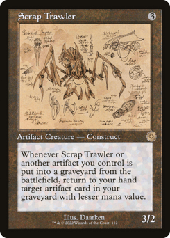 Whenever this creature dies or another artifact you control is put into a graveyard from the battlefield, return to your hand target artifact card in your graveyard with lesser mana value.