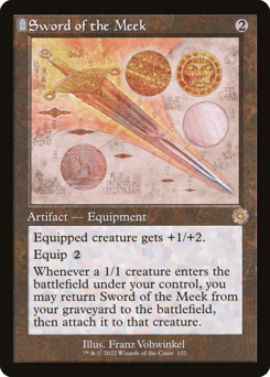 Equipped creature gets +1/+2. Equip {2} Whenever a 1/1 creature you control enters, you may return this card from your graveyard to the battlefield, then attach it to that creature.