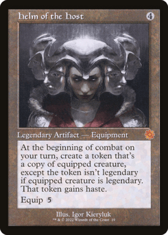 At the beginning of combat on your turn, create a token that's a copy of equipped creature, except the token isn't legendary. That token gains haste. Equip {5}