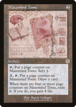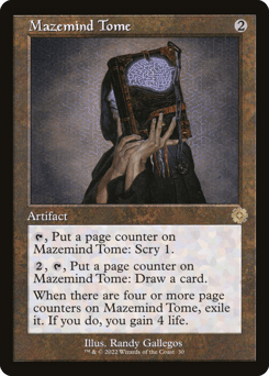 {T}, Put a page counter on this artifact: Scry 1. (Look at the top card of your library. You may put that card on the bottom.) {2}, {T}, Put a page counter on this artifact: Draw a card. When there are four or more page counters on this artifact, exile it. If you do, you gain 4 life.