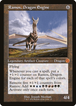 Flying Whenever you cast a spell, put a +1/+1 counter on Ramos for each of that spell's colors. Remove five +1/+1 counters from Ramos: Add {W}{W}{U}{U}{B}{B}{R}{R}{G}{G}. Activate only once each turn.