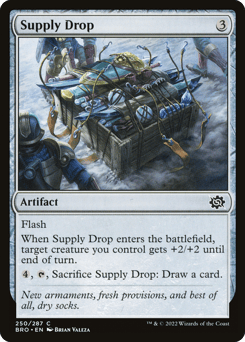 Flash When this artifact enters, target creature you control gets +2/+2 until end of turn. {4}, {T}, Sacrifice this artifact: Draw a card.