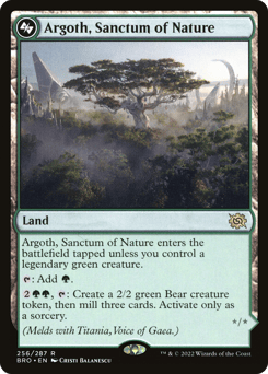 This land enters tapped unless you control a legendary green creature. {T}: Add {G}. {2}{G}{G}, {T}: Create a 2/2 green Bear creature token, then mill three cards. Activate only as a sorcery. (Melds with Titania, Voice of Gaea.)