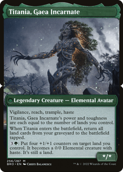 Vigilance, reach, trample, haste Titania's power and toughness are each equal to the number of lands you control. When Titania enters, return all land cards from your graveyard to the battlefield tapped. {3}{G}: Put four +1/+1 counters on target land you control. It becomes a 0/0 Elemental creature with haste. It's still a land.