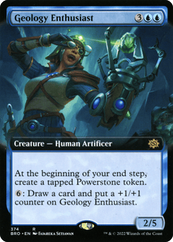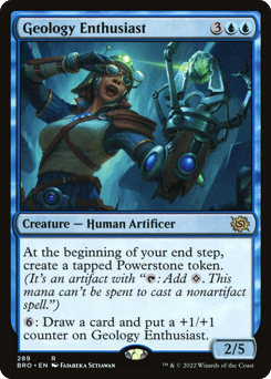 Vigilance At the beginning of your end step, create a tapped Powerstone token. (It's an artifact with "{T}: Add {C}. This mana can't be spent to cast a nonartifact spell.") {5}: Draw a card and put a +1/+1 counter on Geology Enthusiast.
