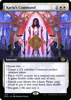 Choose two — • Create a 2/2 colorless Construct artifact creature token. • Put a +1/+1 counter on a creature you control. It gains double strike until end of turn. • Search your library for a basic Plains card, reveal it, put it into your hand, then shuffle. • You gain 2 life and scry 2.