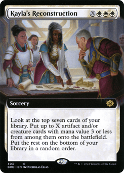 Look at the top seven cards of your library. Put up to X artifact and/or creature cards with mana value 3 or less from among them onto the battlefield. Put the rest on the bottom of your library in a random order.
