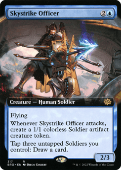 Flying Whenever this creature attacks, create a 1/1 colorless Soldier artifact creature token. Tap three untapped Soldiers you control: Draw a card.