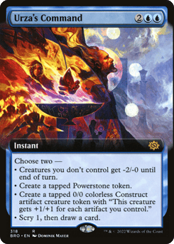 Choose two — • Creatures you don't control get -2/-0 until end of turn. • Create a tapped Powerstone token. • Create a tapped 0/0 colorless Construct artifact creature token with "This token gets +1/+1 for each artifact you control." • Scry 1, then draw a card.