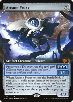 Prototype {1}{U}{U} — 2/1 (You may cast this spell with different mana cost, color, and size. It keeps its abilities and types.) When this creature enters, if you cast it, exile target instant or sorcery card with mana value less than or equal to this creature's power from your graveyard. Copy that card. You may cast the copy without paying its mana cost.