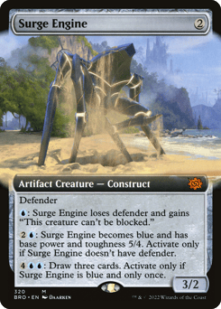 Defender {U}: This creature loses defender and gains "This creature can't be blocked." {2}{U}: This creature becomes blue and has base power and toughness 5/4. Activate only if this creature doesn't have defender. {4}{U}{U}: Draw three cards. Activate only if this creature is blue and only once.