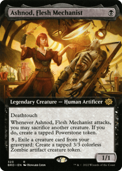Deathtouch Whenever Ashnod attacks, you may sacrifice another creature. If you do, create a tapped Powerstone token. {5}, Exile a creature card from your graveyard: Create a tapped 3/3 colorless Zombie artifact creature token.