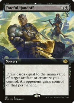 Draw cards equal to the mana value of target artifact or creature you control. An opponent gains control of that permanent.