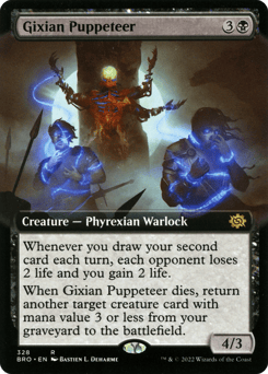 Whenever you draw your second card each turn, each opponent loses 2 life and you gain 2 life. When this creature dies, return another target creature card with mana value 3 or less from your graveyard to the battlefield.
