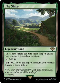 The Shire enters tapped unless you control a legendary creature. {T}: Add {G}. {1}{G}, {T}, Tap an untapped creature you control: Create a Food token.