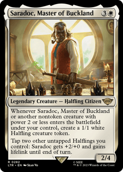 Whenever Saradoc or another nontoken creature you control with power 2 or less enters, create a 1/1 white Halfling creature token. Tap two other untapped Halflings you control: Saradoc gets +2/+0 and gains lifelink until end of turn.