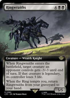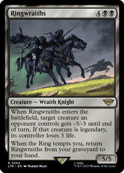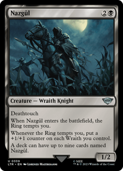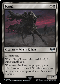 Deathtouch When this creature enters, the Ring tempts you. Whenever the Ring tempts you, put a +1/+1 counter on each Wraith you control. A deck can have up to nine cards named Nazgûl.