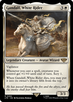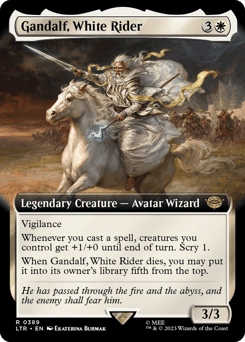 Vigilance Whenever you cast a spell, creatures you control get +1/+0 until end of turn. Scry 1. When Gandalf dies, you may put it into its owner's library fifth from the top.