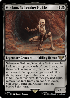 Whenever Gollum attacks, look at the top two cards of your library, put them back in any order, then choose land or nonland. An opponent guesses whether the top card of your library is the chosen kind. Reveal that card. If they guessed right, remove Gollum from combat. Otherwise, you draw a card and Gollum can't be blocked this turn.