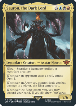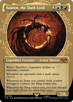 Ward—Sacrifice a legendary artifact or legendary creature. Whenever an opponent casts a spell, amass Orcs 1. Whenever an Army you control deals combat damage to a player, the Ring tempts you. Whenever the Ring tempts you, you may discard your hand. If you do, draw four cards.