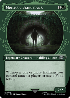 Whenever one or more Halflings you control attack a player, create a Food token. (It's an artifact with "{2}, {T}, Sacrifice this token: You gain 3 life.")