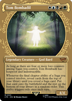 As long as there are four or more lore counters among Sagas you control, Tom Bombadil has hexproof and indestructible. Whenever the final chapter ability of a Saga you control resolves, reveal cards from the top of your library until you reveal a Saga card. Put that card onto the battlefield and the rest on the bottom of your library in a random order. This ability triggers only once each turn.