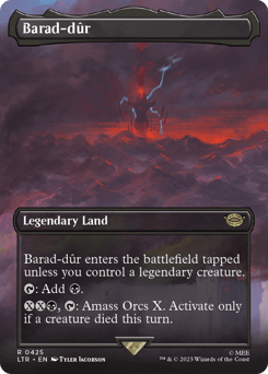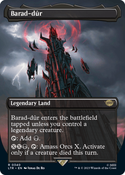 Barad-dûr enters tapped unless you control a legendary creature. {T}: Add {B}. {X}{X}{B}, {T}: Amass Orcs X. Activate only if a creature died this turn.